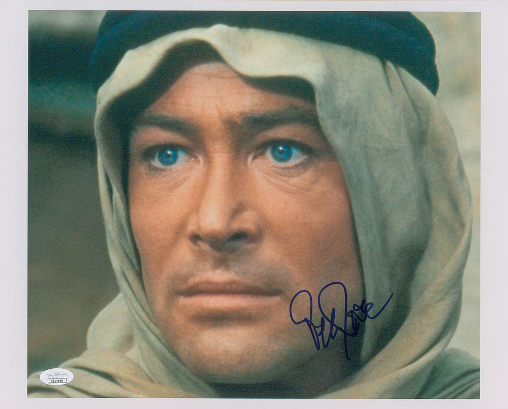 Color glossy 15 x 12 of O'Toole as T. E. Lawrence from the epic 1962 film Lawrence of Arabia, signed in blue felt tip. In fine condition, with a JSA label affixed to the lower corner. Accompanied by a certificate of authenticity from JSA.
