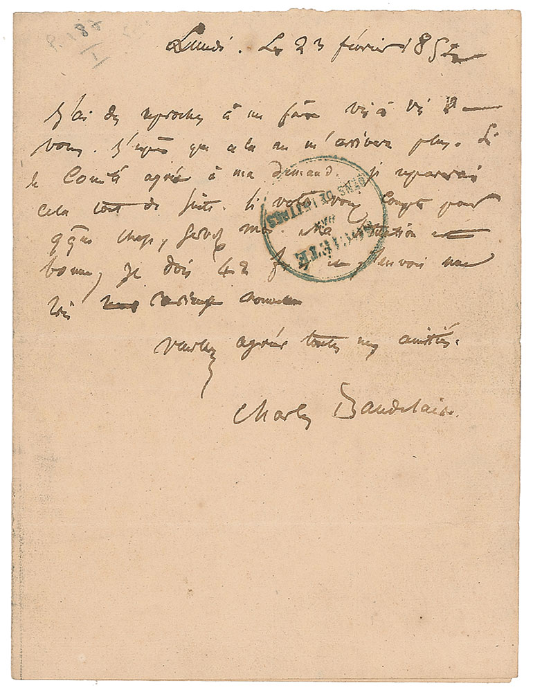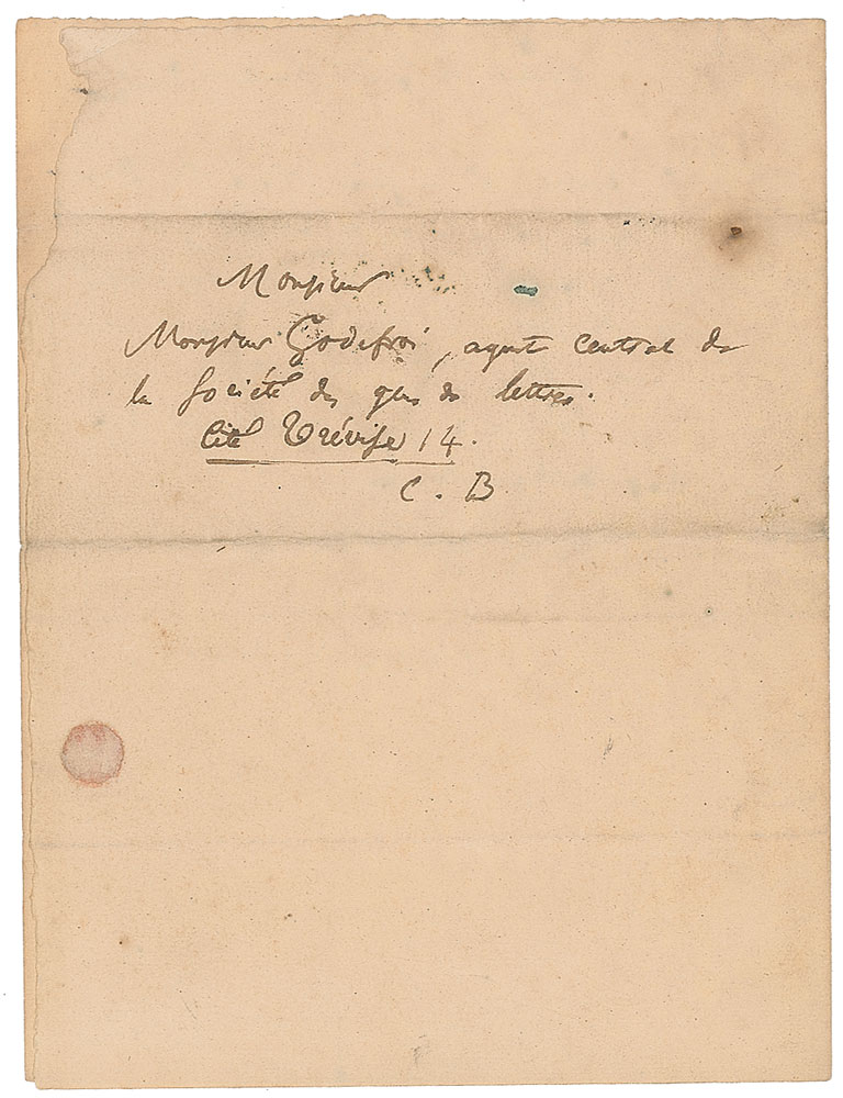 Influential French writer (1821-1867) best known for his highly imaginative and experimental verse, including the seminal 1857 collection Les Fleurs du Mal. ALS in French, one page, 5.5 x 7.25, February 23, 1852. Letter to Louis-Stanislas Godefroy, an agent of the Society of the Arts, in part (translated): "I have reproaches to make against you. I hope it will not happen to me anymore. If the committee agrees to my request I will correct the situation immediately. If your opinion carries any weight please help me. My situation is good. I owe 42 francs and I have some very curious news to give to you." Addressed on the second integral leaf in Baudelaire's hand. In fine condition.