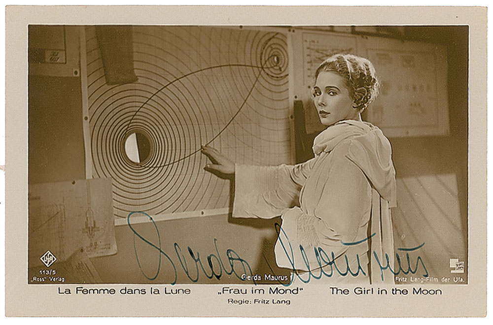 Austrian actress (1903-1968) who was discovered by director Fritz Lang and appeared in a number of German films during the Weimar and Nazi eras. Vintage 5.5 x 3.5 postcard photo of Gerda Maurus as Friede Velten from Fritz Lang's 1929 science-fiction film Woman in the Moon, signed in fountain pen. In fine condition.