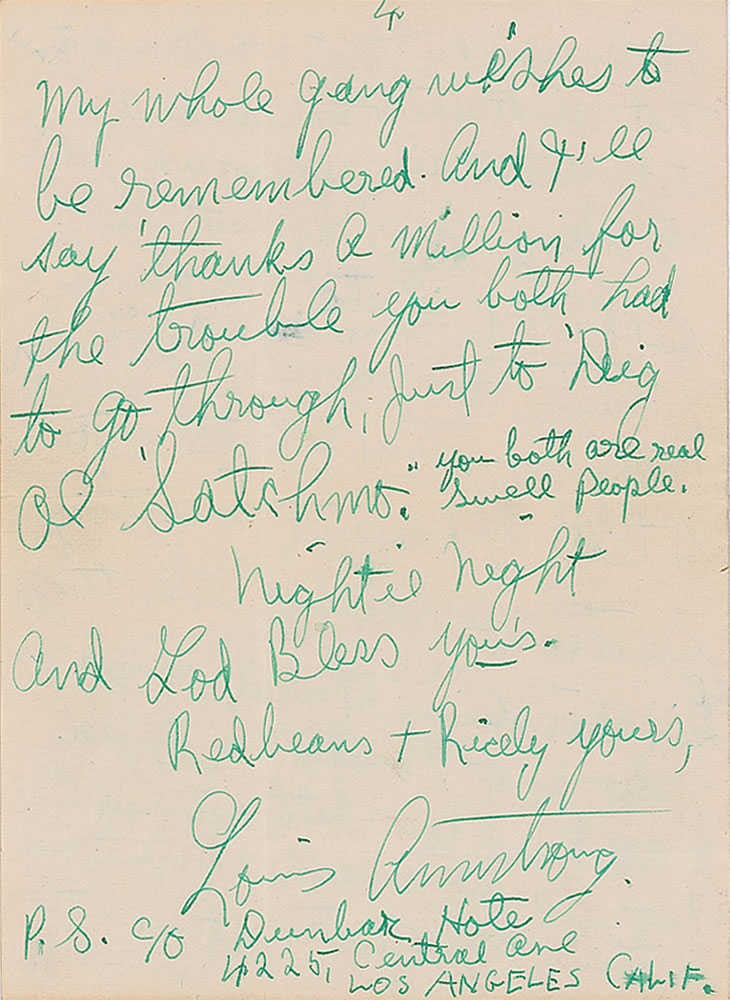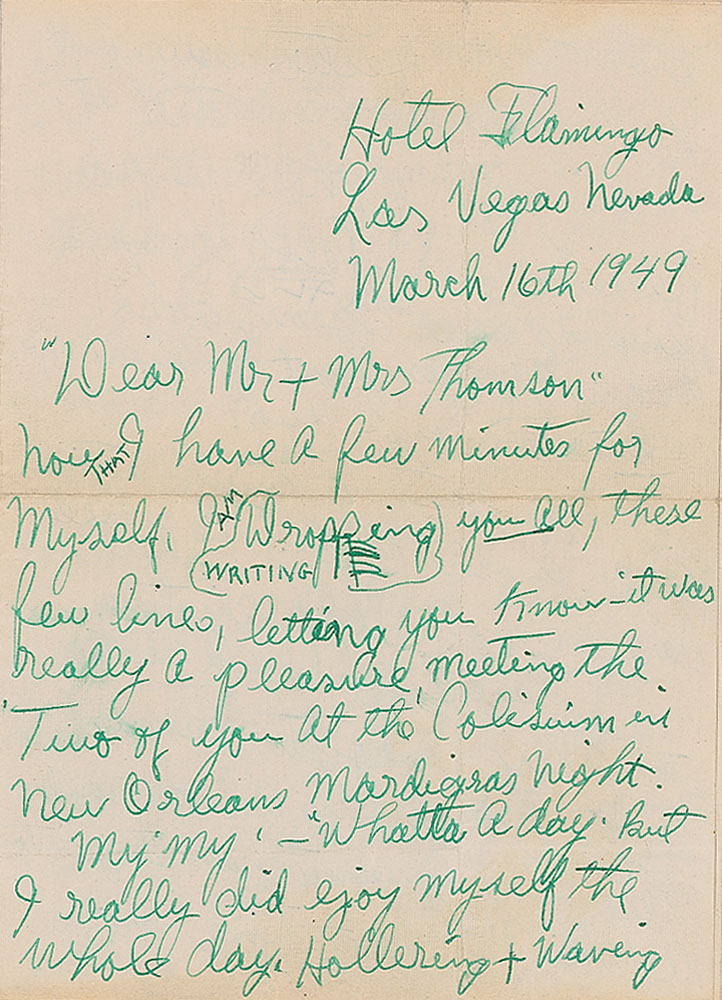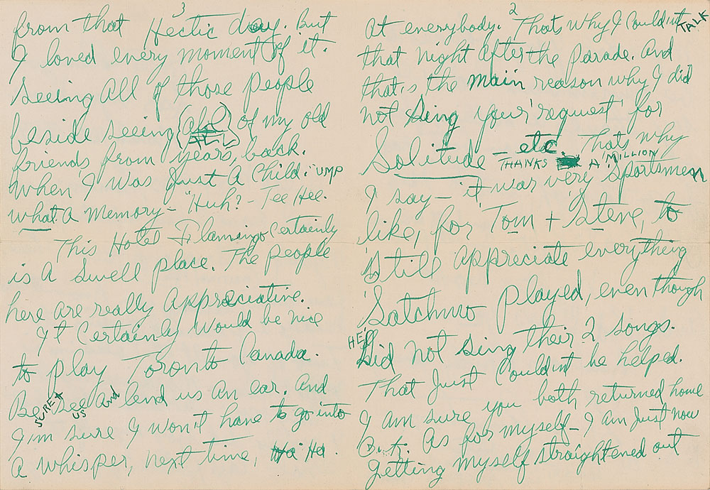 ALS signed “Louis Armstrong," and twice within the text as "Satchmo,” four pages on two adjoining sheets, 5.25 x 7.25, March 16, 1949. Written from the Hotel Flamingo in Las Vegas, a letter to Mr. and Mrs. Tom Thomson, in part: "I am writing you all these few lines, letting you know it was really a pleasure meeting the two of you at the Coliseum in New Orleans Mardi Gras night. My My—what a day. But I really did enjoy myself the whole day. Hollering & waving at everybody. That's why I couldn't talk that night after the parade. And that's the main reason why I did not sing your 'request' for Solitude—etc…it was very sportsmen like, for Tim & Steve, to have still appreciate everything Satchmo played, even though he did not sing their 2 songs. That just couldn't be helped…I am just now getting myself straightened out from that hectic day. But I loved every moment of it. Seeing all of those people beside seeing all of my old friends from years back, when I was just a child. What a memory—huh? Tee hee….Thanks a million for the trouble you both had to go through just to dig ol Satchmo. You both are real swell people." In fine condition. Accompanied by the original mailing envelope addressed in Armstrong's hand.