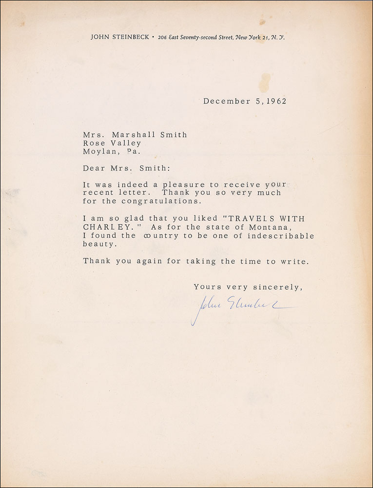 TLS, one page, 8.5 x 11, personal letterhead, December 5, 1962. Letter to Mrs. Marshall Smith, in full: "It was indeed a pleasure to receive your recent letter. Thank you so very much for the congratulations. I am so glad that you liked 'Travels with Charley.' As for the state of Montana, I found the country to be one of indescribable beauty. Thank you again for taking the time to write." In fine condition, with mild edge toning an a few small stains at the top.