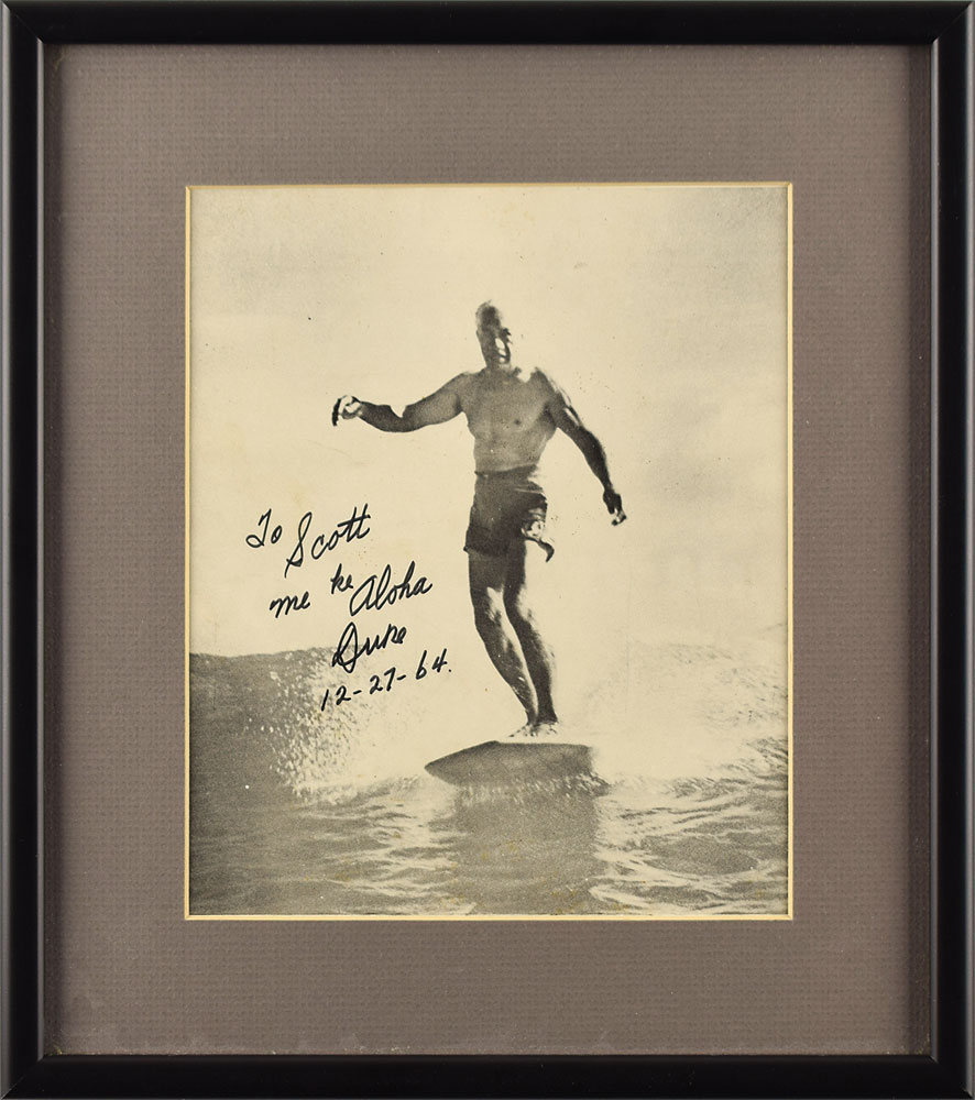 Hawaiian swimmer and actor (1890-1968) credited with spreading the sport of surfing. Scarce vintage 7.25 x 8.75 magazine photo of Duke Kahanamoku surfing in later age, signed and inscribed in black felt tip, "To Scott, Me ke Aloha, Duke, 12-27-64.” Matted and framed to an overall size of 11.75 x 13.25. In fine condition, with a few small creases.