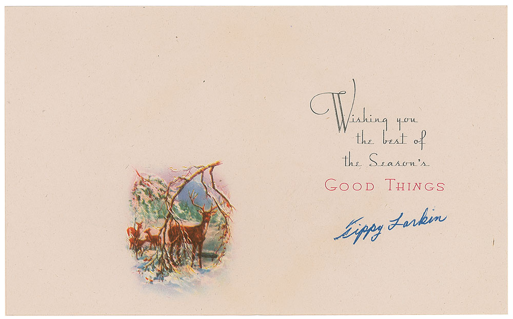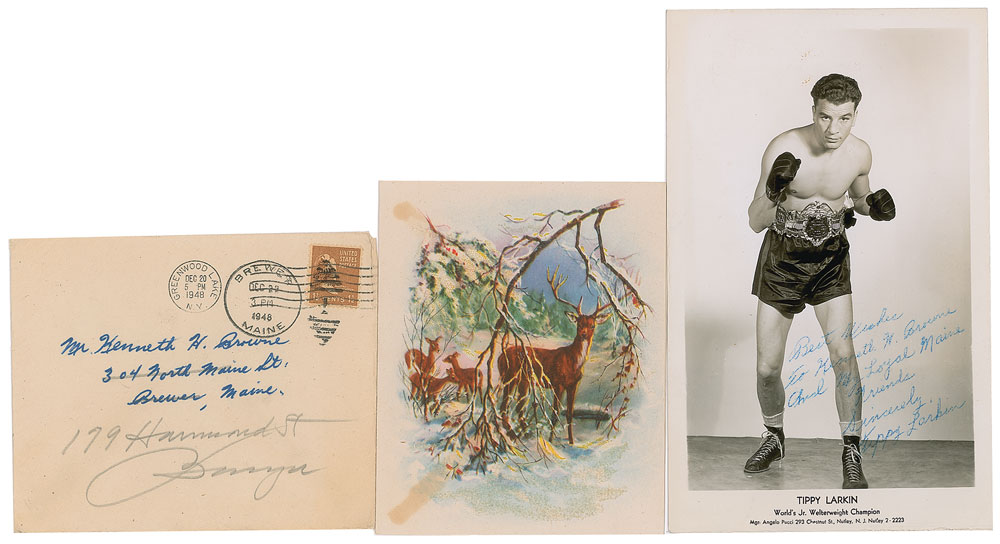 Boxer who appeared on the cover of The Ring magazine in July 1944 and was at one time the world's junior welterweight champion (1917-1991). Two items: a vintage glossy 5 x 8 full-length photo of Larkin in his World's Junior Lightweight Champion belt, signed and inscribed in blue ballpoint, "Best Wishes to Kenneth H. Browne and my loyal Maine friends, Sincerely, Tippy Larkin"; and a 4.5 x 5.5 season's greetings card, signed inside in fountain pen, "Tippy Larkin." In overall very good to fine condition, with scattered light surface impressions to the photo. Accompanied by the original mailing envelope for the card, addressed in Larkin's hand.