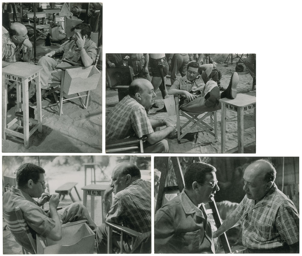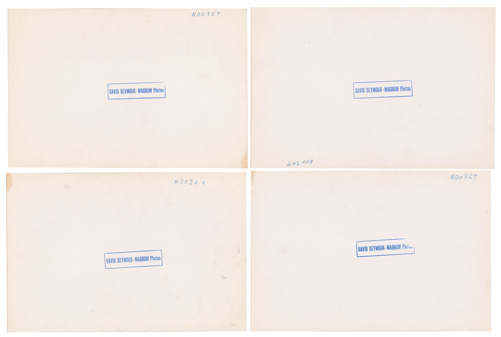 Polish photographer and photojournalist (1911-1956) remembered for co-founding Magnum Photos, who was killed by Egyptian machinegun fire in the aftermath of the Suez crisis. Four original vintage semi-glossy 11.75 x 8 silver gelatin photos taken by Magnum photographer David Seymour on an MGM set. All bear David Seymour/Magnum credit stamps on the reverse. In overall fine condition.