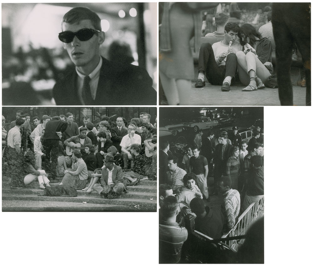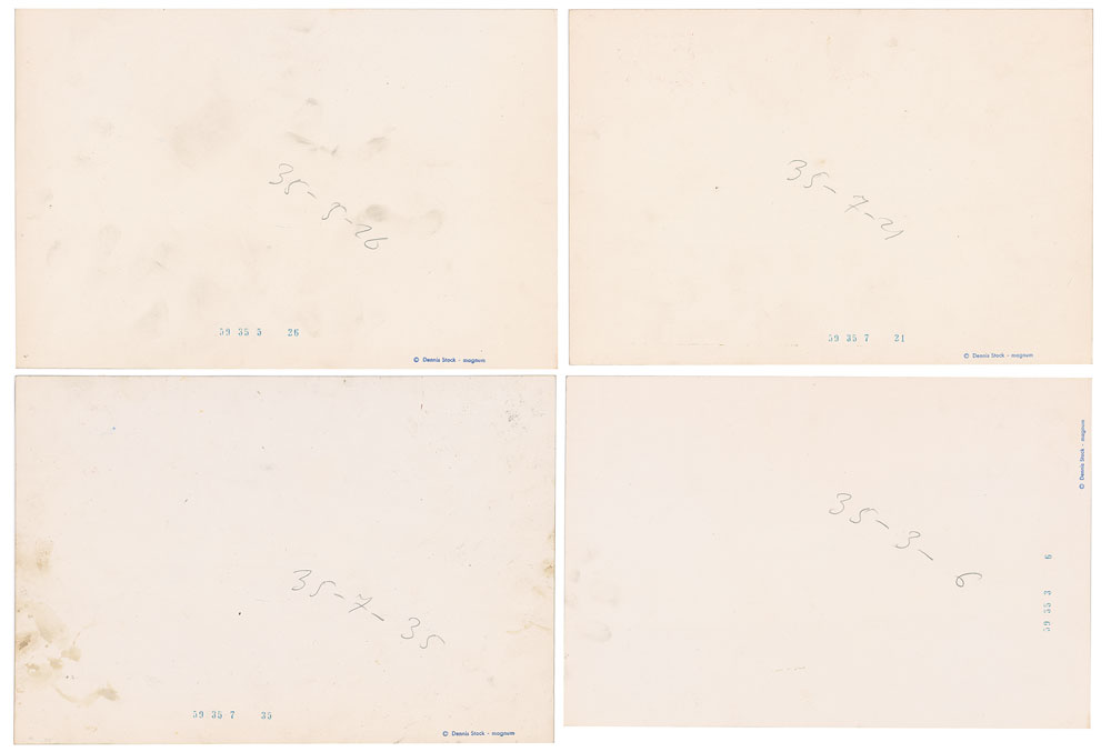 American photojournalist (1928-2010) remembered for his photographs of James Dean, jazz musicians, and contrasting regional scenes. Four original vintage semi-glossy 11.75 x 8 silver gelatin photos taken by Magnum photographer Dennis Stock, including a portrait of a man in sunglasses, two outdoor musical scenes, and one street scene. All bear Dennis Stock/Magnum credit stamps on the reverse. In overall fine condition.