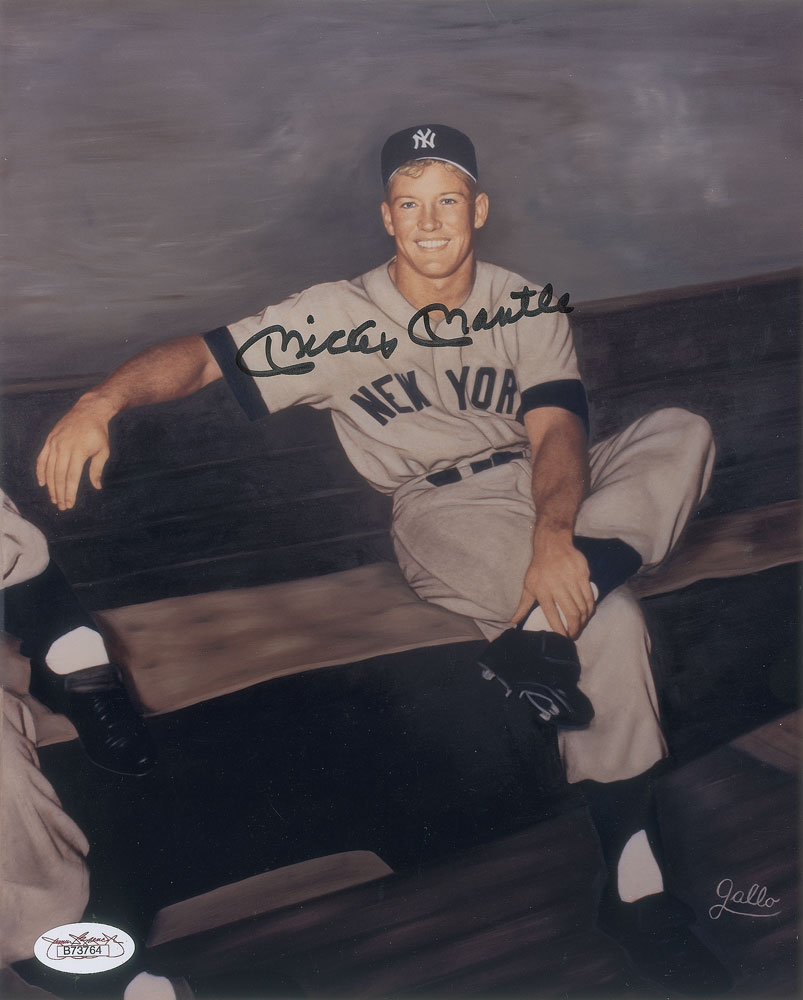 Color satin-finish 8 x 10 photo of Raymond Gallo's famous image entitled 'The Mighty Mick of '56,' signed in black felt tip by Mantle. In fine condition, with a JSA label affixed to the lower corner. Accompanied by a full letter of authenticity from JSA.