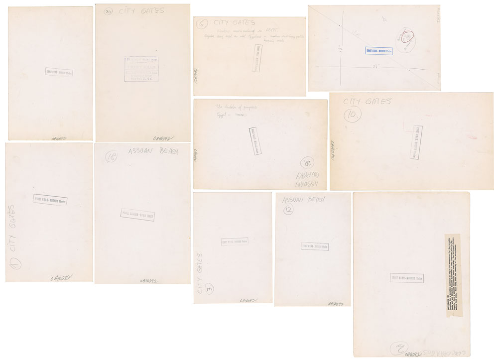 Austrian-American photojournalist (1921-1986) remembered as an early innovator in color photography. His photographs were published in magazines like Life and Vogue and, in 1962, were the subject of the first single-artist exhibition of color photography at New York's Museum of Modern Art. Group of twelve original vintage silver gelatin photos taken by Ernst Haas, 11.75 x 7.25 to 14 x 9.75, all showing a Hollywood film being shot in Egypt. All bear Ernst Haas/Magnum Photos credit stamps on the reverse. In overall fine condition.