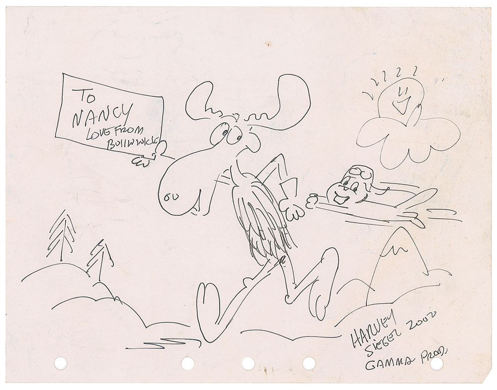 Original ink sketch of Rocky and Bullwinkle by cartoonist Harvey Siegel, who signs in the lower right corner, "Harvey Siegel 2002, Gamma Prod." Accomplished in ink on an off-white 11 x 8.5 sheet of artist paper, the sketch depicts the two characters flying and running against a forest backdrop, with the good-natured moose holding a sign with inscription, "To Nancy, Love from Bullwinkle." In very good to fine condition, with overall creasing and a short tear to the right edge.