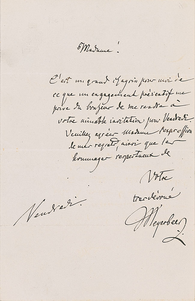 German-born composer (1791-1864) best known for such operas as Les Hugenots and Robert le diable. ALS in French, signed “Meyerbeer,” one page, 5.25 x 8.25, personal letterhead, no date. Letter to philanthropist Cecile Heine, in full (translated): "It is with great sorrow for me that a previous engagement already arranged deprives me of the pleasure to come to your lovely invitation for Friday. Please receive, Madame, the expression of my regret together with respectful homage from your very devoted." In fine condition. Accompanied by the original mailing envelope addressed by Meyerbeer.