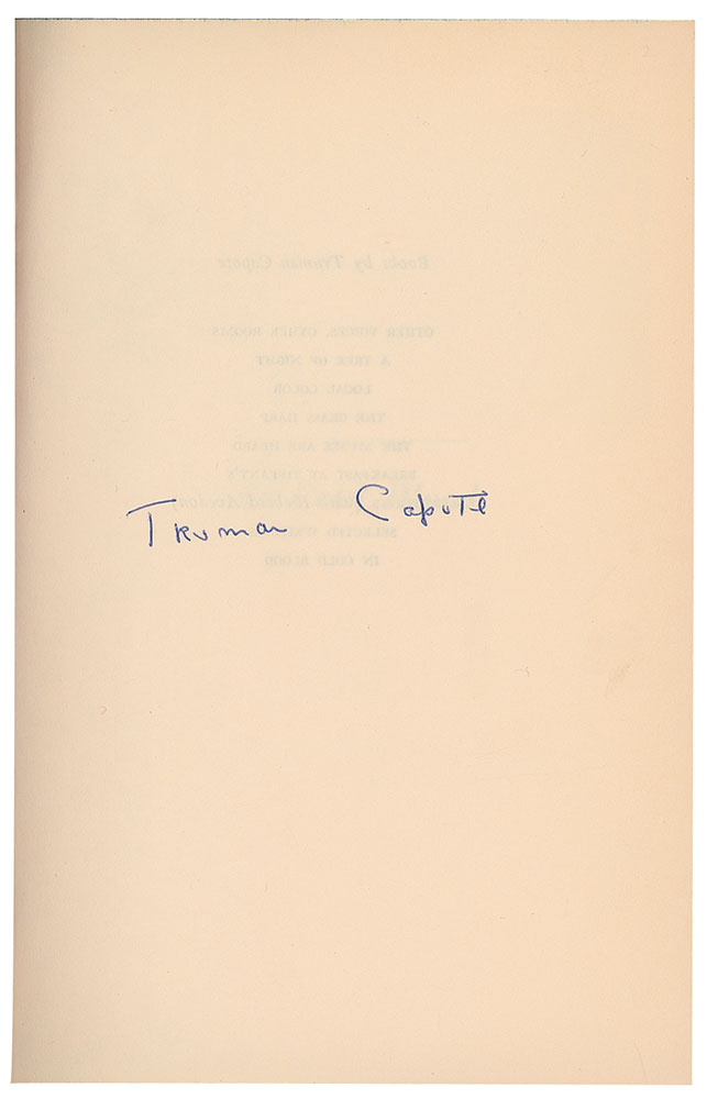 Signed book: In Cold Blood. First edition, first printing. NY: Random House, 1965. Hardcover with dust jacket (price-clipped with 1/66 date on lower front flap), 6 x 8.5, 343 pages. Signed on a free end page in blue ballpoint, "Truman Capote." Autographic condition: fine. Book condition: NF/NF, with a price-clipped dust jacket.