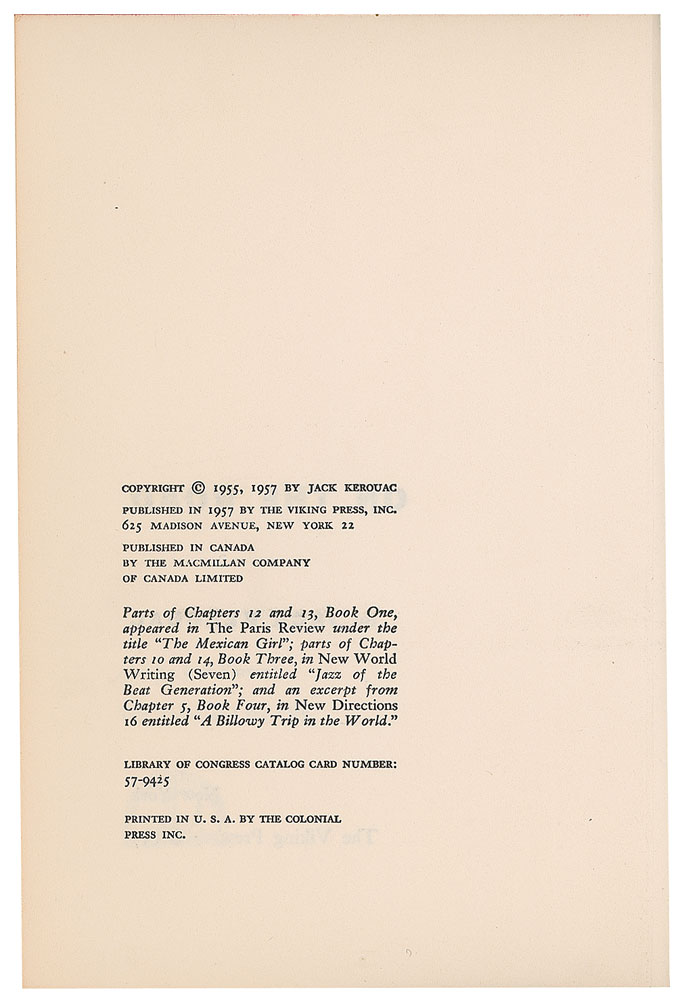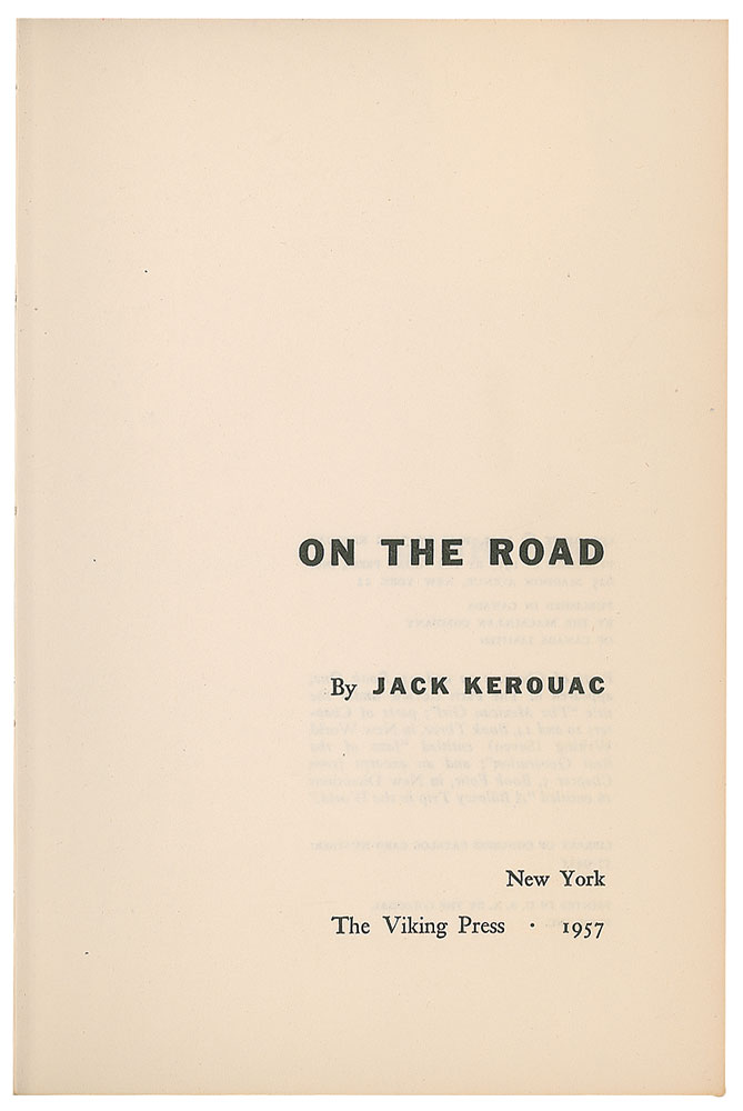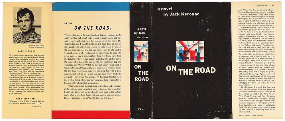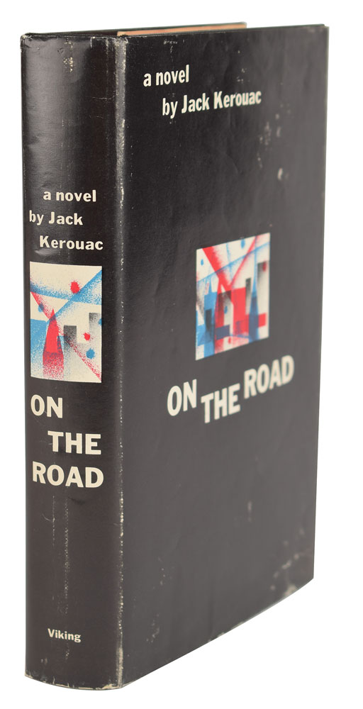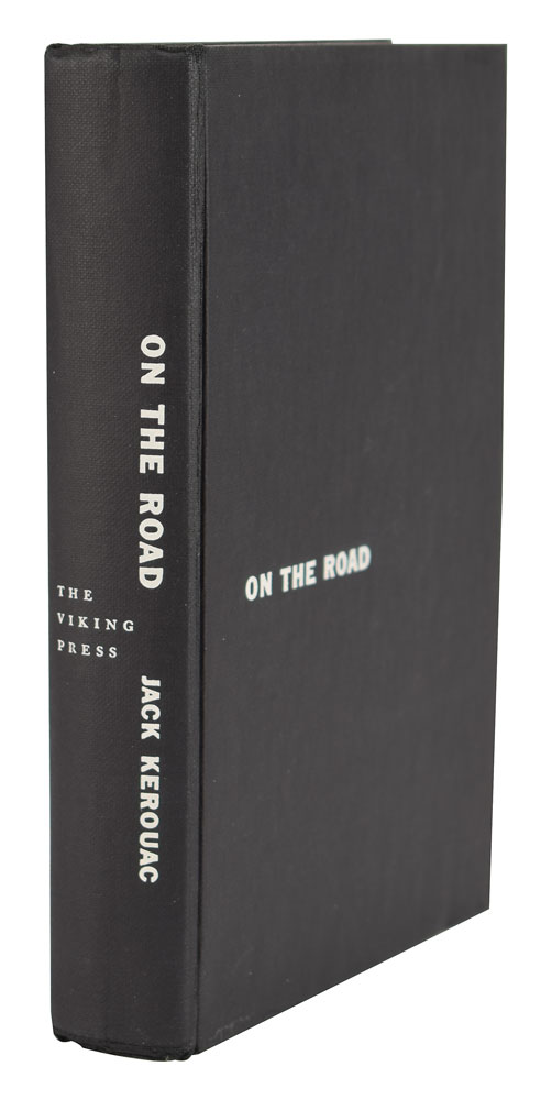 Unsigned first edition book: On the Road by Jack Kerouac. First edition, first printing. NY: The Viking Press, 1957. Hardcover with dust jacket (with $3.95 price on front flap and blue and red stripes on rear panel), 5.75 x 8.25, 310 pages. Book condition: VG+/VG, with a small tear to the front panel of the dust jacket, and some rubbing to the jacket. A superb example of this classic Beat Generation novel, named by both Time Magazine and Modern Library as one of the top 100 novels of the century.