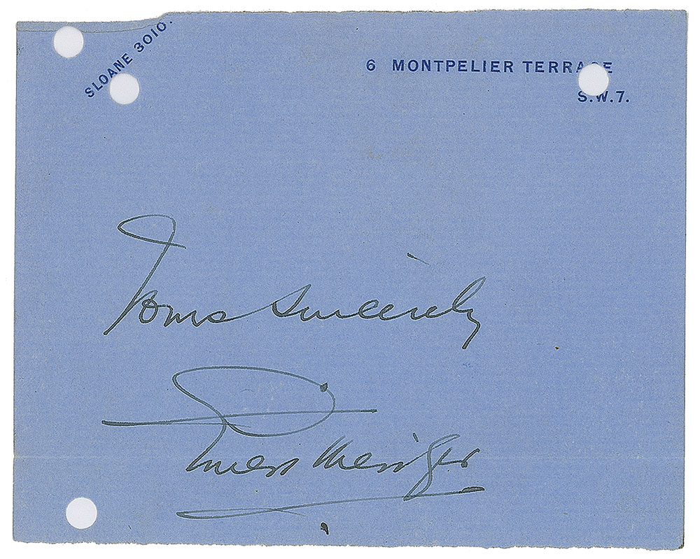 Character actor (1879-1961) best remembered as the mad scientist Dr. Pretorius in The Bride of Frankenstein. Fountain pen signature, "Yours sincerely, Ernest Thesiger,” on a blue 4.5 x 3.5 trimmed sheet of 6 Montpelier Terrace stationery. In fine condition, with a horizontal fold passing through the signature and several inexplicable punch holes to the sheet.