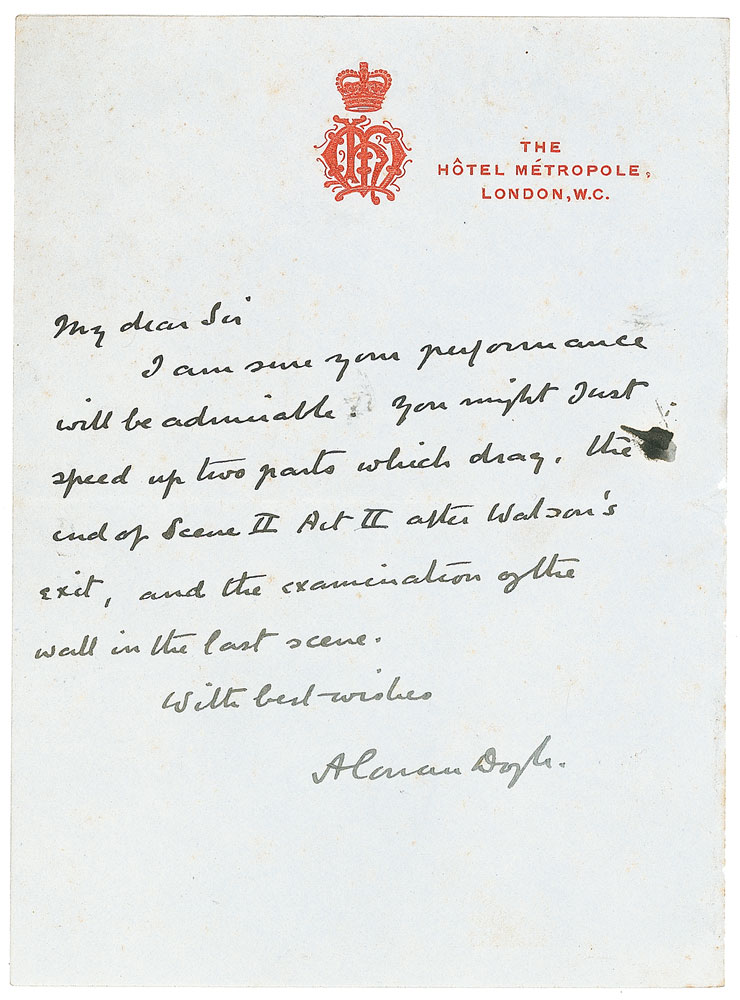 ALS, signed "A. Conan Doyle," one page, 5 x 7, Hôtel Métropole letterhead, no date. Doyle writes to an unnamed actor, in full: "I am sure your performance will by admirable. You might just speed up two parts which drag the end of Scene II Act II after Watson's exit, and the examination of the wall in the last scene." A few subtle wrinkles, very faint foxing to upper portion, and a stray ink blot, otherwise fine condition. The writing is clear and bold throughout.