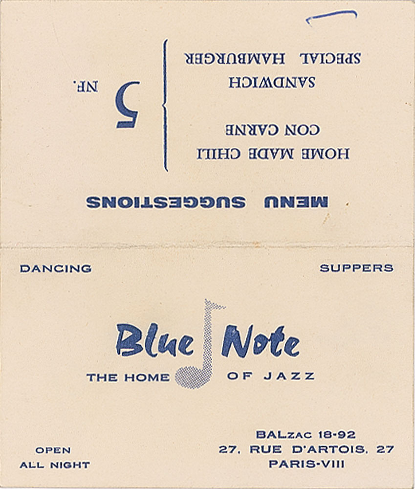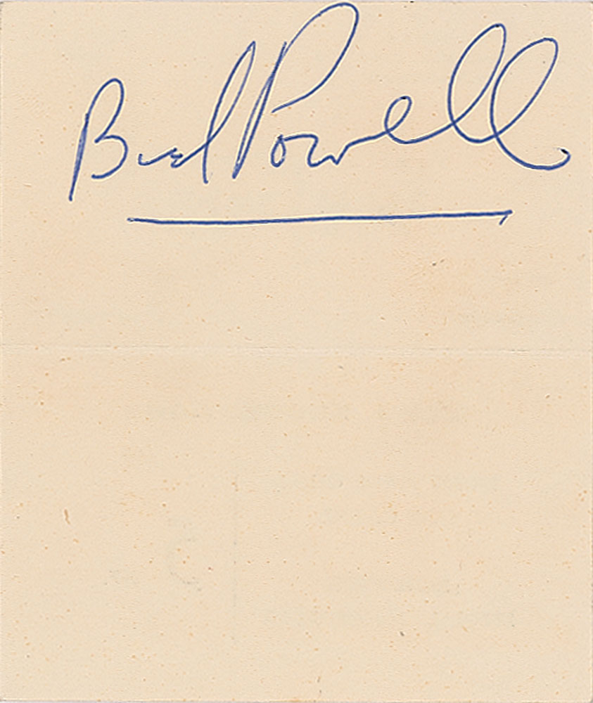 Jazz pianist (1924-1966) influential in the development of bebop. Vintage ballpoint signature, "Bud Powell,” on the inside of an off-white 3.25 x 4 table card for the Blue Note jazz club of Paris. In fine condition.