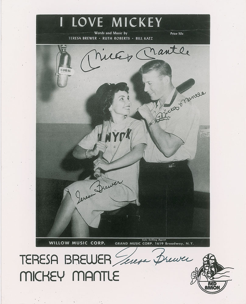 Glossy 8 x 10 photo of the sheet music for Teresa Brewer's 'I Love Mickey,' signed in black felt tip by both Mickey Mantle and Teresa Brewer. Also bears facsimile signatures inherent to the image of the sheet music cover. In fine condition.