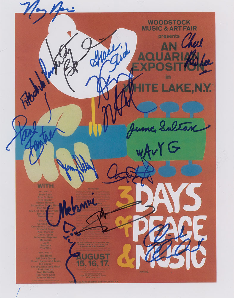 Color glossy 11 x 14 photo of the poster for the three-day Woodstock Music & Art Fair, signed in blue or black felt tip by 14 performers or musicians, including: Pete Townshend, Grace Slick, Paul Kantner, Marty Balin, Wavy Gravy, Melanie, Nancy Nevins, Juma Sultan, Chick Churchill, Rick Lee, Fito de la Parra, Harvey Mandel, Jerry Velez, and Tom Constanten. In fine condition.