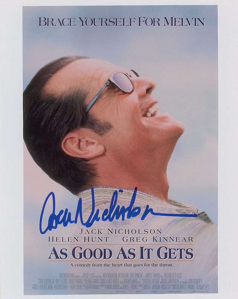 Color glossy 8 x 10 photo of the poster for the Oscar-winning 1997 film As Good as It Gets, signed in blue felt tip by Jack Nicholson. In very fine condition.
