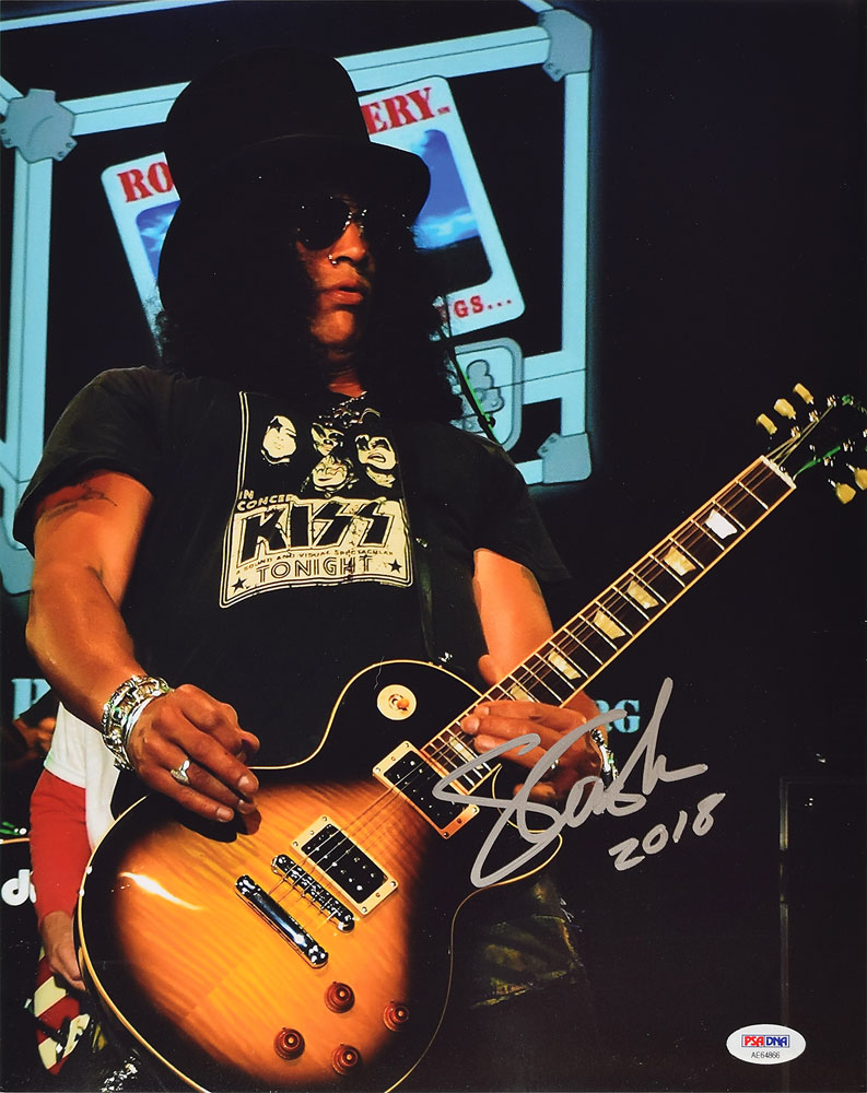 Color satin-finish 11 x 14 half-length photo of the Guns N' Roses guitarist wearing a KISS shirt, signed in silver ink, "Slash, 2018." In fine condition, with a PSA/DNA label affixed to lower right corner. Accompanied by a certificate of authenticity from PSA/DNA.