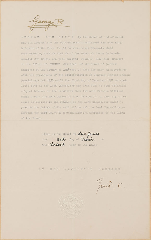 DS as king, signed “George R.,” one page, 9.25 x 14.75, December 10, 1951. King George appoints Francis Williams "to the Office of Deputy Chairman of the Court of Quarter Sessions of Our County of Anglesey." Signed in the upper left by the king. Affixed to a same-size cardstock mount. In fine condition.