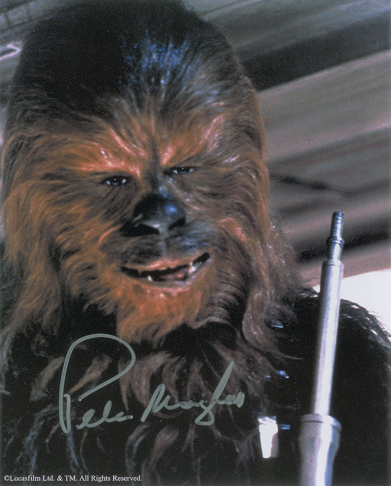Color 8 x 10 cardstock photo of Chewbacca from Star Wars, signed in silver ink by Peter Mayhew. In very fine condition.