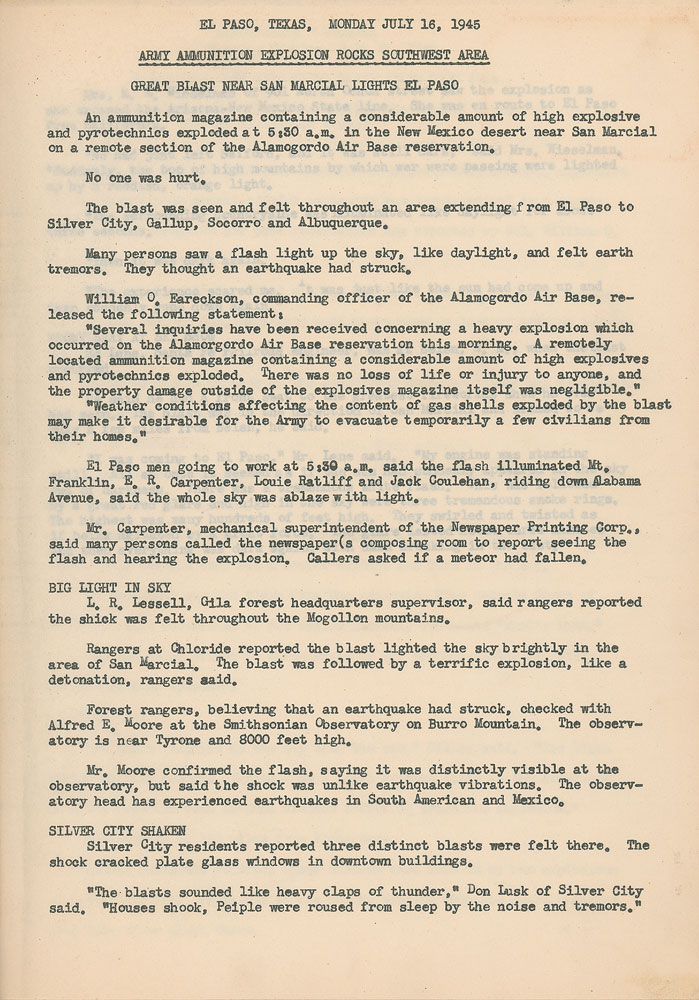 Vintage bracket-bound dossier belonging to Inez O'Brien, a member of the Provisional Engineer Detachment who worked on the Manhattan Project at Los Alamos during World War II. The dossier consists of numerous copies of articles published around the time of the Manhattan Project, dating from around July 16th to August 10th, 1945, several of which derive from the Albuquerque Journal. Headlines include: “Army Ammunition Explosion Rocks Southwest Area,” “Alamogordo Base Explosives Blast Jolts Wide Area,” “’Atomizers’ from ‘Hill’ Enjoy Minor V-E Day,” “’Fiery Orange Ball’ Seen 250 Miles Off: That Was Nagasaki,” and “Workers Stick to Jobs on ‘The Hill’ in Face of Disclosure of Project’s Terrible Secret.” Inside of dossier bears an affixed ownership label belonging to O'Brien. In fine condition.