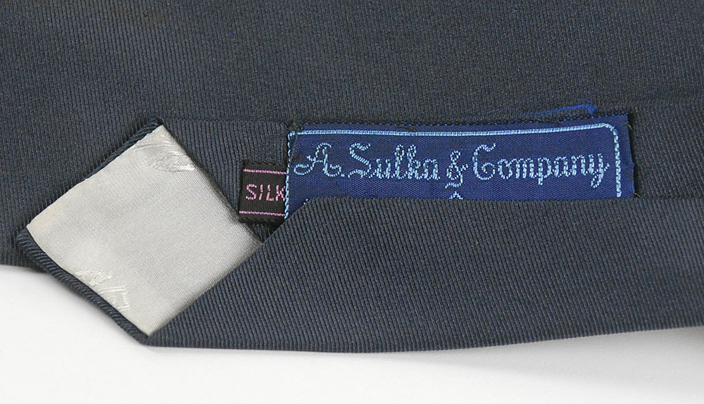President Kennedy’s personally-owned and -worn navy blue silk neck tie with small embroidered gray design accents, made by A. Sulka & Company, measuring 54″ long. Manufacturer’s and material tags are sewn to the underside of the narrow end. In fine condition. Accompanied by a letter of provenance signed by David J. Powers, son of David F. Powers, who was JFK’s close friend and assistant. In part: “Many consider my father to have been President Kennedy’s best friend. They campaigned together from 1946 to 1963, and traveled the world together on presidential visits from 1960 to 1963. During their travels, they frequently needed to switch from casual attire to something more formal. My father and JFK were not the same size, but that mattered little when it came to neckties. This A. Sulka & Company navy silk tie with a gray graphic design was worn by JFK and subsequently ended up with my father, who may have worn it as well, as they did share on occasion. My father carefully separated this tie from others that were his alone and preserved it among his valuable memorabilia and archives.” While any items worn by presidents are incredibly desirable, the status of John and Jacqueline Kennedy as American fashion icons make pieces worn by them even more appealing. Highly sought-after, and with its excellent provenance from the Powers family, this is an extraordinary presidential piece.