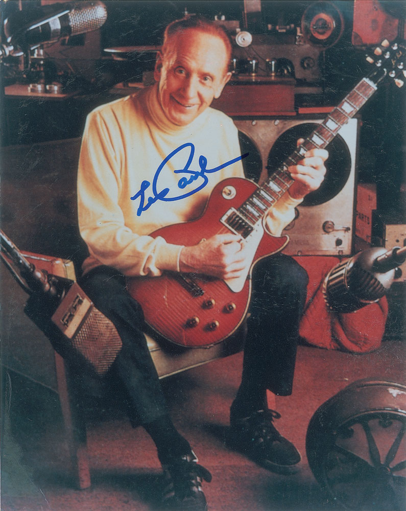 Color satin-finish 8 x 10 photo of Les Paul with one of his own electric guitars, signed in blue felt tip. In very good to fine condition, with light overall scuffing. Originally obtained by in-person specialist Mike Wehrmann.