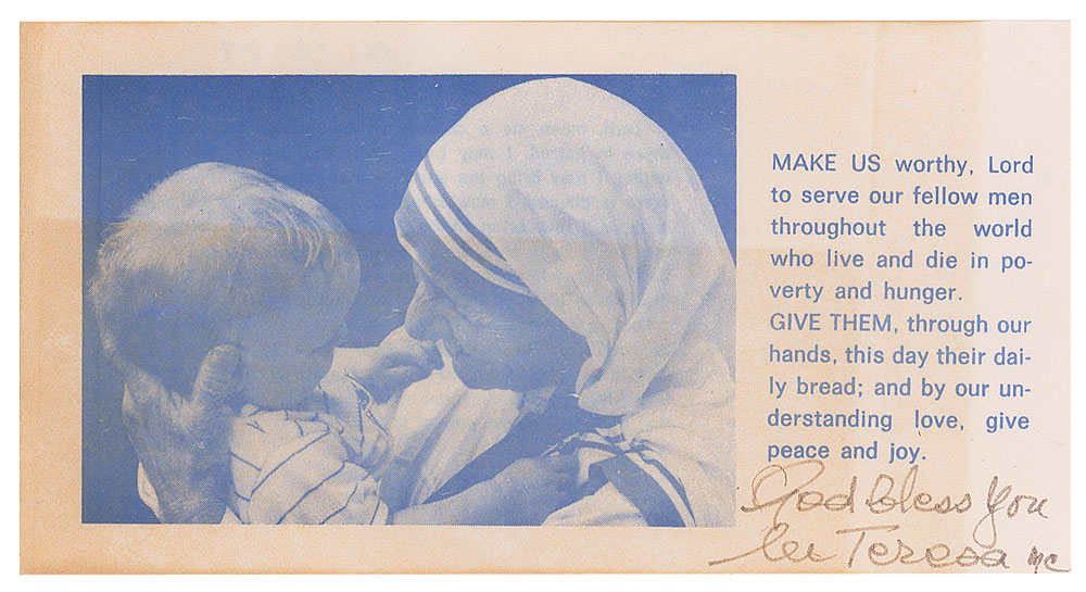 Prayer slip depicting Mother Teresa holding a child, 6.25 x 3.25, signed in black ink, "God bless you, M Teresa mc." Pencil notation on reverse dates the signature to December 16, 1993. In very good to fine condition, with a vertical fold to the left side, and light irregular toning.