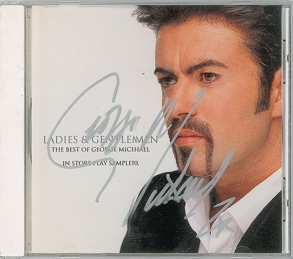 Demonstration CD for Ladies & Gentlemen: The Best of George Michael, signed on the front of the booklet in silver ink. In fine condition, with a light crease to the left edge. The CD is included.