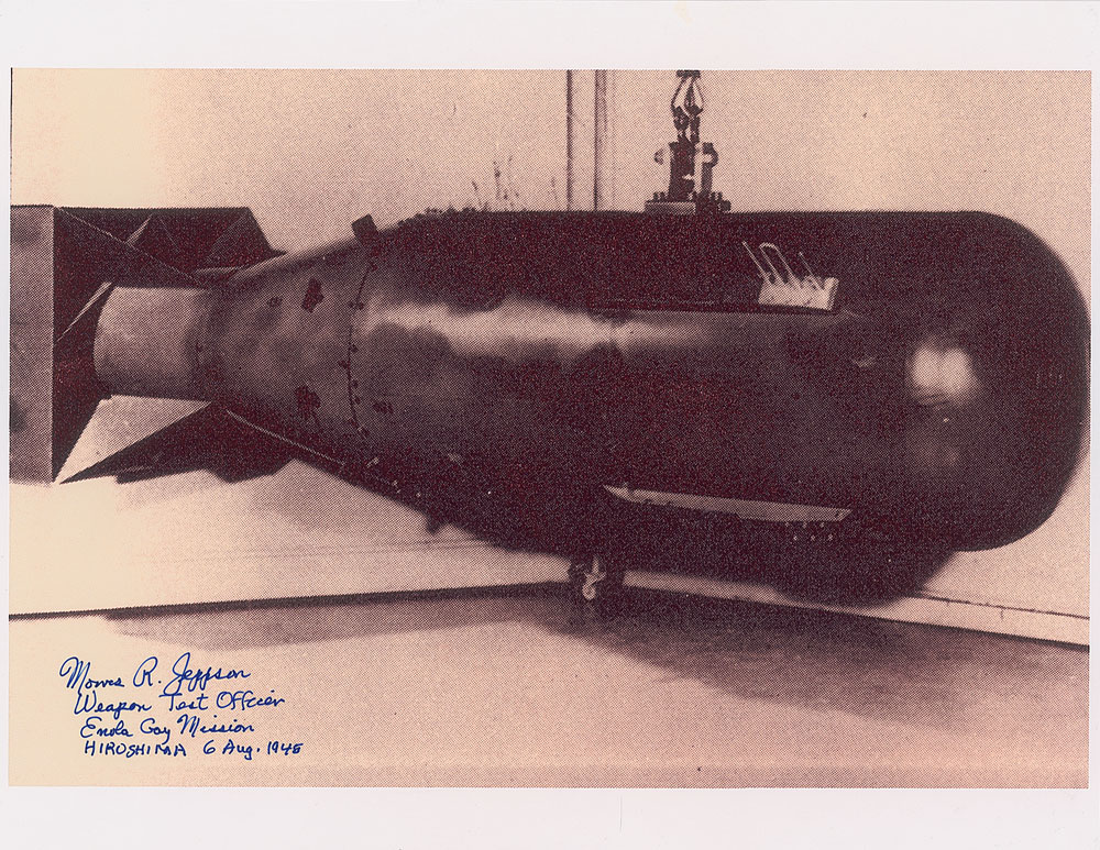 Glossy 11 x 8.5 laserprint photo of a model of the 'Little Boy' atomic bomb, a replica of the one the Enola Gay dropped on Hiroshima on August 6, 1945, signed in black ink, "Morris R. Jeppson, Weapon Test Officer, Enola Gay Mission, Hiroshima, 6 Aug. 1945." In fine condition.