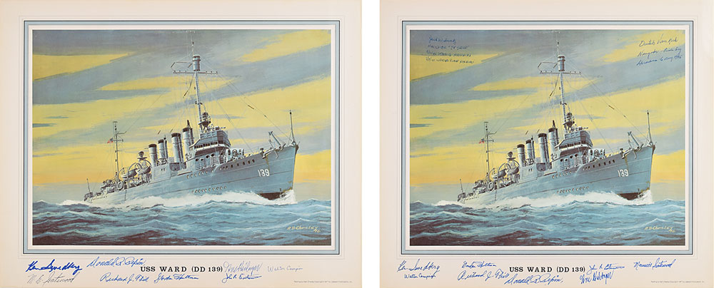 Two color 20 x 16 posters of an Alan Chesley painting depicting the USS Ward (DD-139), a Wickes-class destroyer in the United States Navy that fired the first American shots of World War II, both signed in the lower border in ink or felt tip by eight of her crew-members: Donald R. Pepin, Richard J. Thill, Kenneth Swedberg, Eugene Heiberger, Gordon Hultman, Maurice Gatewood, John Entenmann, and Walter Campion. One poster is also signed by Theodore 'Dutch' Van Kirk, the navigator for Enola Gay, and by Jack Widowsky, the navigator for Top Secret, the aircraft assigned as the strike spare for the Hiroshima bombing mission. In overall fine condition. The USS Ward (DD-139) caused the first American-caused casualties in World War II, when she engaged a Japanese midget submarine before the attack on Pearl Harbor, and successfully sank her, killing the two-man crew on board.
