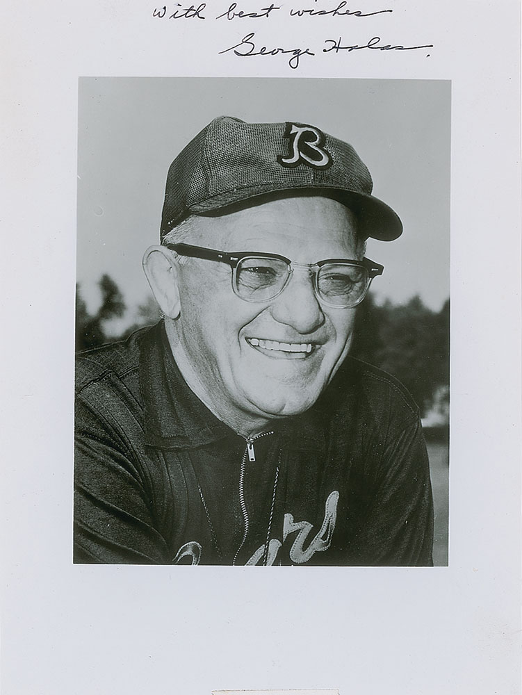 Glossy 7 x 9.5 close-up photo of George Halas wearing his Chicago Bears coaching attire, signed in black ink, "With best wishes, George Halas." In very good to fine condition, with a light scratch passing diagonally across the image.