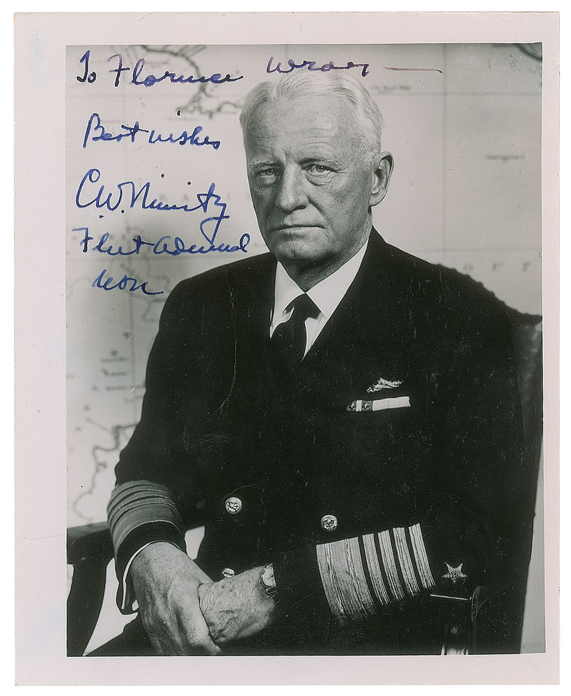 Vintage semi-glossy 4 x 5 seated portrait of Nimitz in his military uniform, signed and inscribed in fountain pen, "To Florence Wray—Best wishes, C. W. Nimitz, Fleet Admiral, USN.” In very good to fine condition, with light edge rippling, and a vertical crease to Nimitz's jacket.