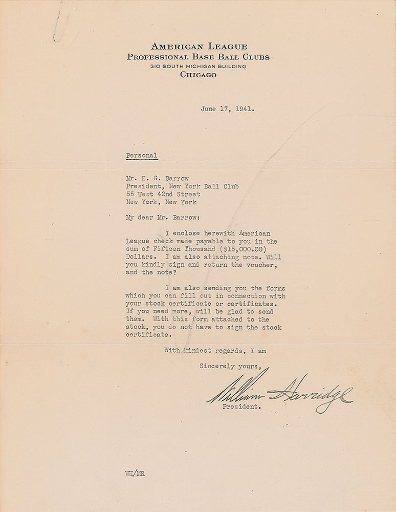 TLS signed “William Harridge,” one page, 8.5 x 11, American League letterhead, June 17, 1941. Letter to New York Yankees executive Edward G. Barrow, in part: "I enclose herewith American League check made payable to you in the sum of Fifteen Thousand ($15,000.00) Dollars. I am also attaching note. Will you kindly sign and return the voucher, and the note? I am also sending you the forms which you can fill out in connection with your stock certificate or certificates." In very good to fine condition, with paperclip impressions to the top edge, and an erased pencil line across the body of the letter. Accompanied by a full letter of authenticity from JSA and Hall of Fame plaque cards of Harrdge and Barrow.