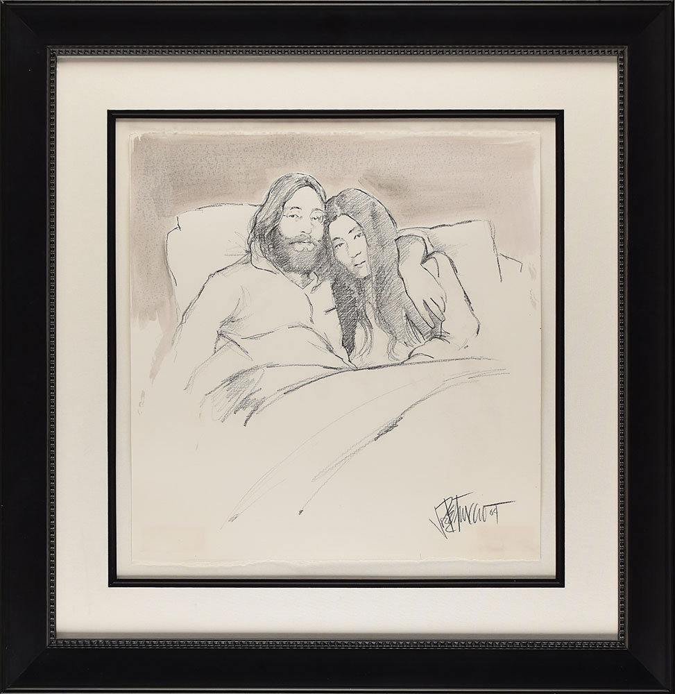 Wonderful original sketch of John Lennon and Yoko Ono by noted rock and roll artist Joe Petruccio, showing the couple during one of their week-long 'Bed-Ins for Peace,' accomplished in graphite and water color on a white 15 x 15.75 sheet of artist paper. Signed in the lower right corner by the artist. Mounted and archivally framed to an overall size of 24.75 x 25.5. In fine condition.