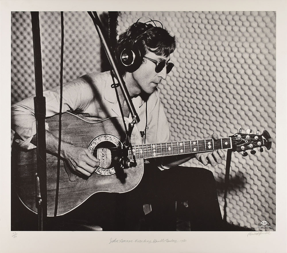 Limited edition 26 x 23 print of a David Spindel photograph showing John Lennon wearing sunglasses and playing the acoustic guitar in a recording studio, entitled 'John Lennon-Recording Double Fantasy-1980,' numbered 23/50, signed in the lower right in pencil by the photographer. In very fine condition.