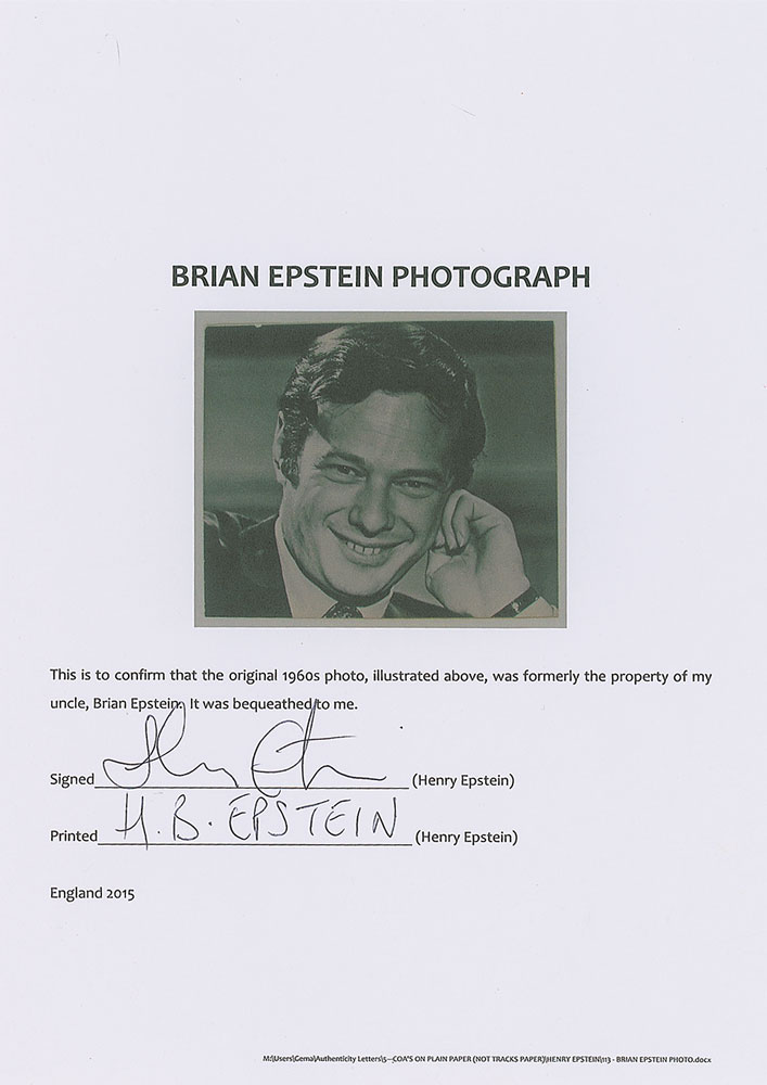 Vintage circa 1960s matte-finish 12 x 10 close-up portrait of Beatles manager Brian Epstein, which is affixed to a same-size mount and once belonged to Epstein himself. In very good to fine condition, with a trivial bit of emulsion loss at the top edge and a diagonal crease to the upper right. Accompanied by a certificate of authenticity from Tracks and a letter of provenance from Epstein's nephew, confirming that "the original 1960s photo...was formerly the property of my uncle, Brian Epstein. It was bequeathed to me."
