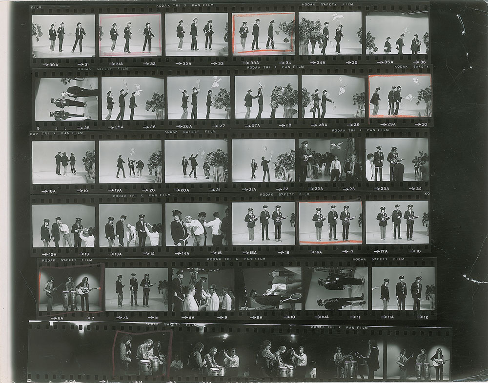Original vintage glossy 11 x 8.5 contact sheet featuring 35 images of Eric Clapton and Cream taken during a 1960s TV appearance. Reverse bears "A Kodak Paper" watermarks. In very good to fine condition, with scattered light creasing, and a tear and staple to the right border. Accompanied by a certificate of authenticity from Tracks.