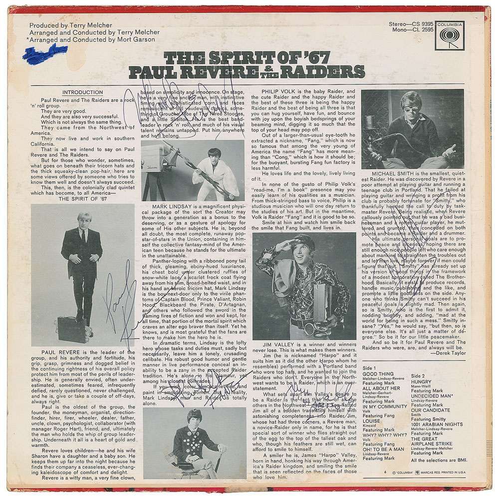 The Spirit of '67 album signed on the reverse in black ballpoint by Paul Revere, Mark Lindsay, Phil 'Fang' Volk, Jim Valley, and Michael Smith. In very good to fine condition, with light scuffing, and a scribbled-out area in the upper left corner. The record is included.