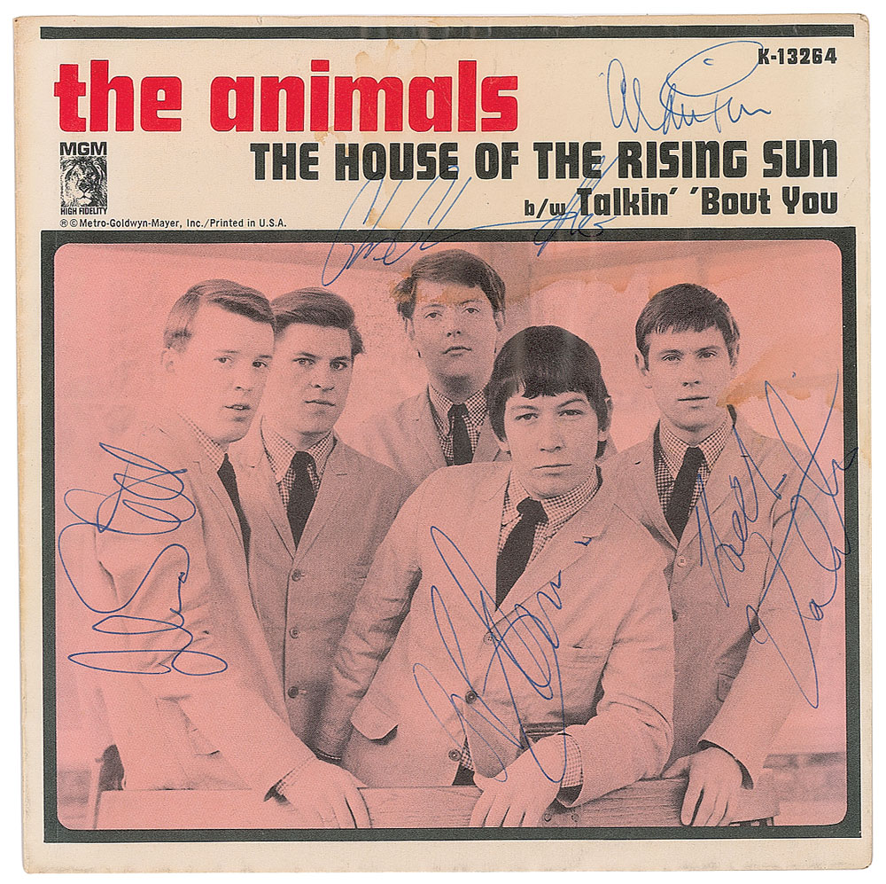 MGM Records 45 RPM picture sleeve for 'The House of the Rising Sun,' signed in blue ballpoint by Eric Burdon, Chas Chandler, Hilton Valentine, John Steel, and Alan Price. In very good condition, with overall wrinkling from dampstaining in the upper right. The record is not included.