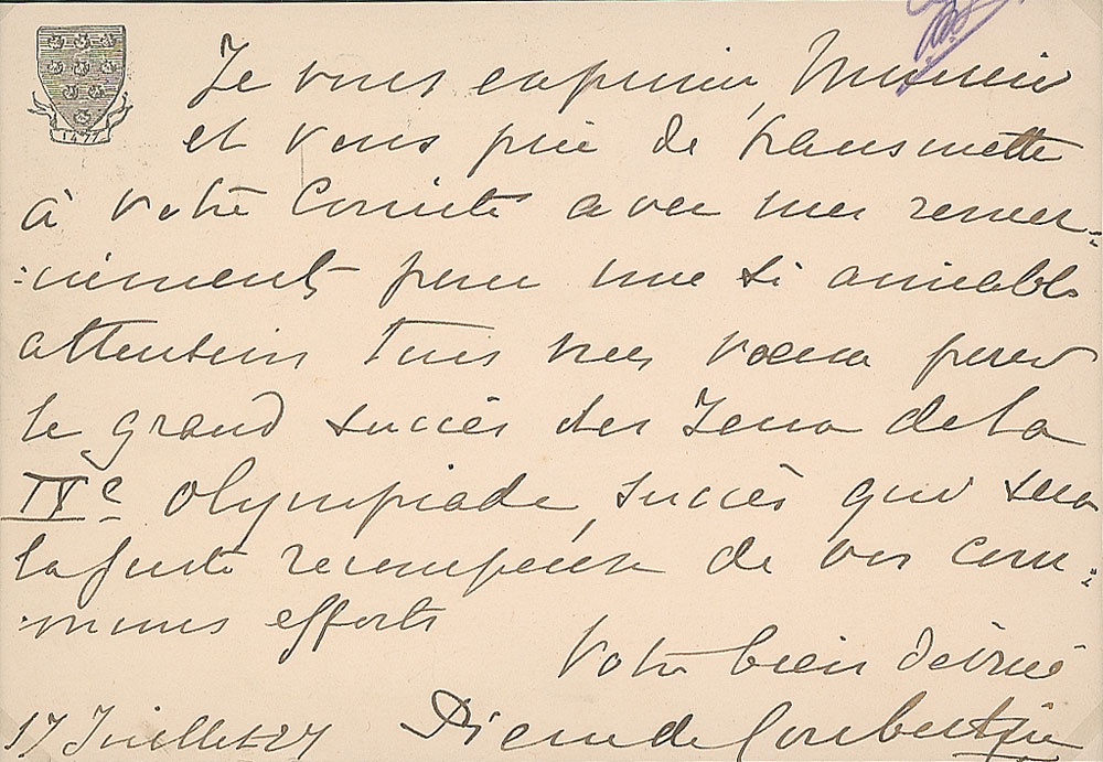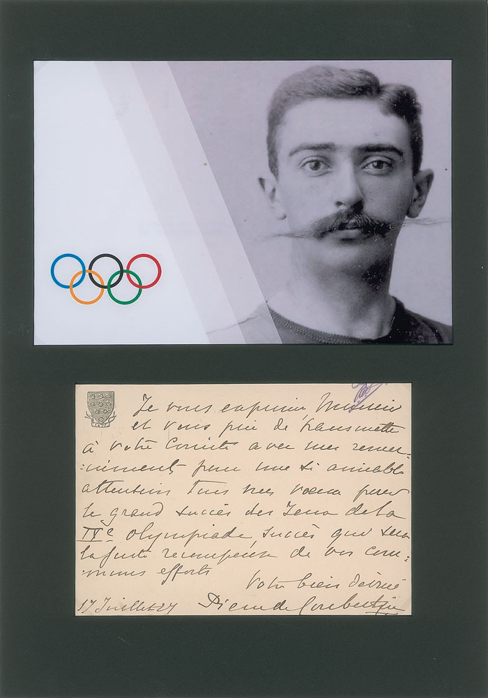 French educator and historian (1863-1937) who is best remembered as being the founder of the International Olympic Committee, and its second President. He is known as the father of the modern Olympic Games. Rare ALS in French, one page on the reverse of a 5.5 x 4 postal card, postmarked July 17, 1927. Untranslated letter extending his thanks for a friendly welcome to the committee and wishing success for the forthcoming 1928 Summer Olympics. Matted with a photo of a young Pierre de Coubertin to an overall size of 8.25 x 11.75. In fine condition.