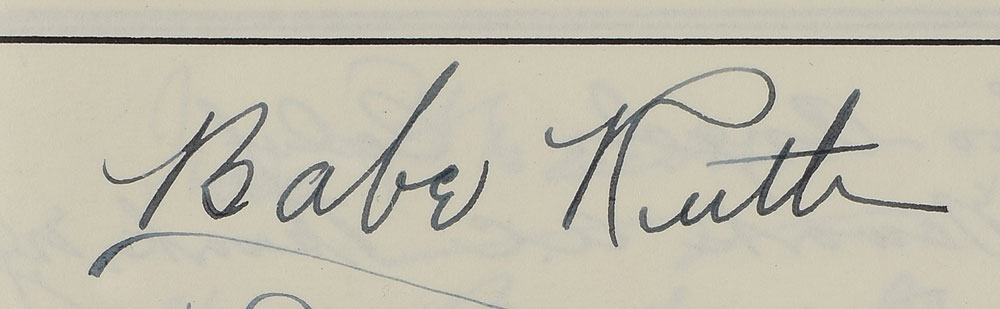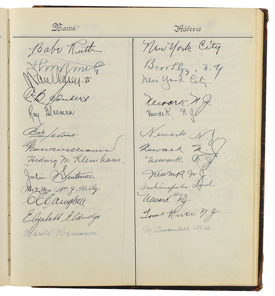 Large circa 1935 guest book from the Newark Athletic Club, 10.75 x 12, signed prominently inside in fountain pen, "Babe Ruth, New York City." The balance of the book contains hundreds of signatures—including that of writer Carl Sandburg—from guests for past Abraham Lincoln birthday celebrations held at the Newark Athletic Club by Valentine Bjorkman, for whom this guest book was dedicated to on January 1, 1936. The guest book is bound in wooden boards with front cover impressively carved with an image of Lincoln reading a book beneath a tree, with text below: "Lincoln Room, Valentine Bjorkman." The cover image was also used for a bookplate created by John Wolcott Adams and issued for the "Lincoln Library of Valentine Björkman." In fine condition. A signature of true Ruthian proportions that's made all the more desirable by his NYC addition.