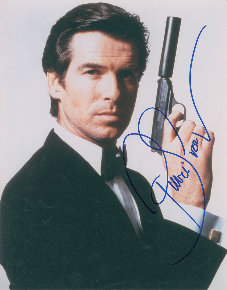 Two classic James Bond photos: a color satin-finish 11 x 14 photo of Pierce Brosnan posing with his silenced handgun, prominently signed in blue felt tip; and a color glossy 11 x 14 photo of Roger Moore in a shooting pose, signed in blue felt tip. In overall very good to fine condition, with light creasing to the Brosnan photo. Originally obtained by in-person specialist Mike Wehrmann.