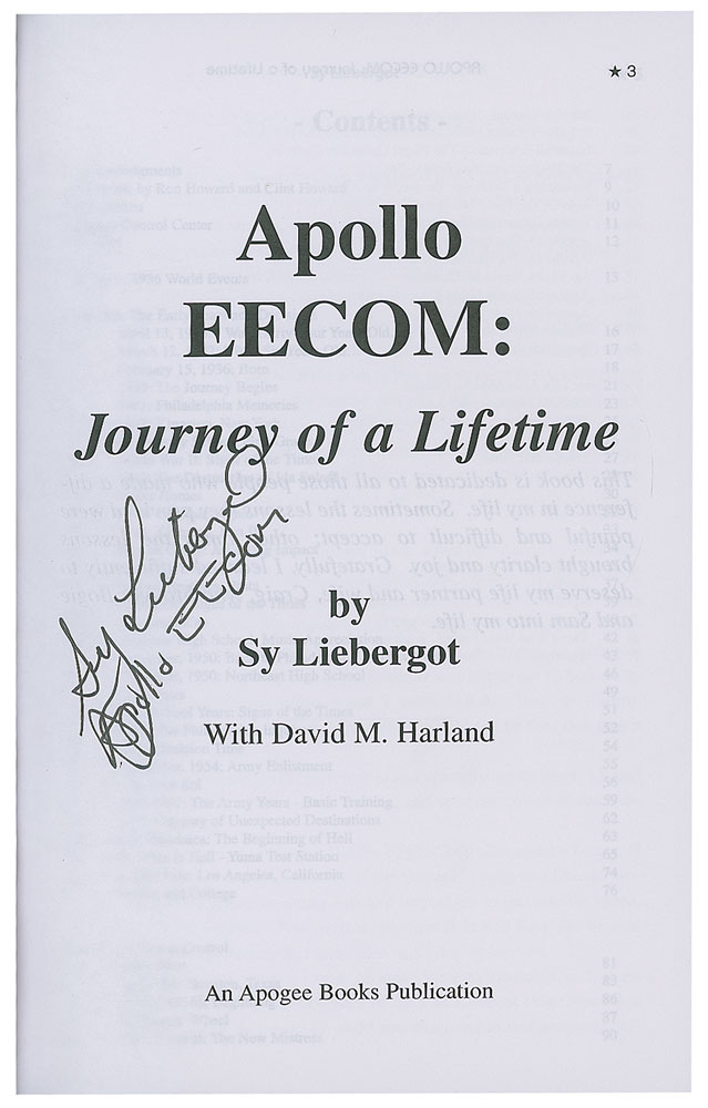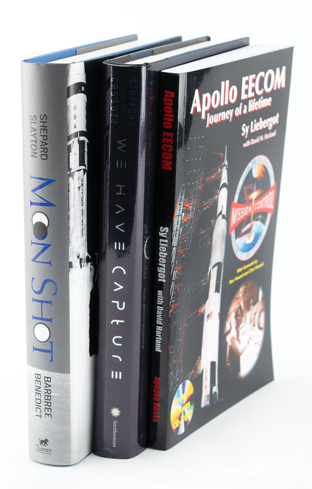 Three books signed by figures of the Apollo Program: Moon Shot, hardcover with dust jacket, signed on a bookplate affixed to the first free end page in blue felt tip by the Apollo 14 moonwalker, "A. Shepard"; We Have Capture, hardcover with dust jacket, signed on the first free end page in black felt tip by the Apollo 10 commander, "Tom Stafford"; and Apollo EECOM: Journey of a Lifetime, softcover, signed on the title page in black felt tip, "Sy Liebergot, Apollo EECOM." In overall very good to fine condition, with fingerprint stains to the Shepard bookplate.