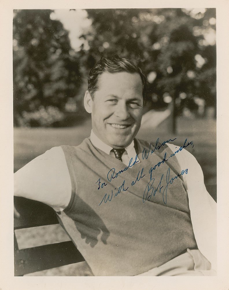 Fantastic vintage matte-finish 8 x 10 photo of the golf legend relaxing on a bench, neatly signed and inscribed in fountain pen, "For Ronald Wilson, With all good wishes, Bob Jones.” In fine to very fine condition.