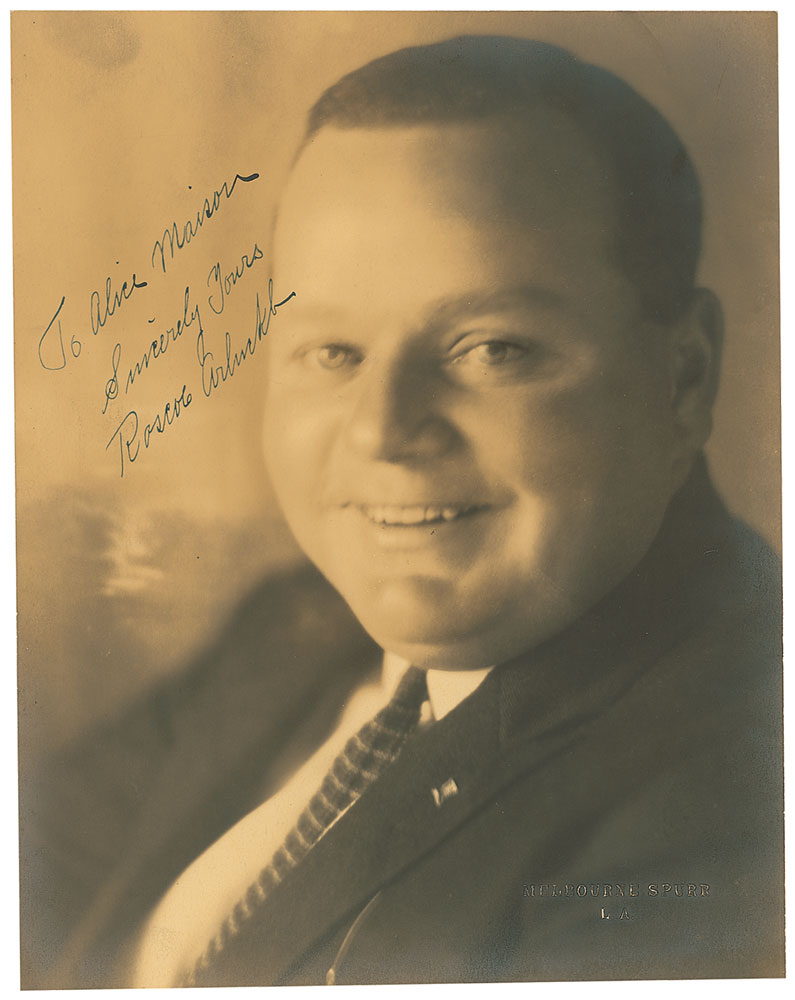 Incredible vintage sepia matte-finish 7.25 x 9.5 Melbourne Spurr portrait of Arbuckle in a suit and tie, crisply signed and inscribed in fountain pen, "To Alice Maison, Sincerely yours, Roscoe Arbuckle." Blindstamped in the lower right by Spurr. In fine condition. Maison was an actress who appeared in a number of silent shorts.