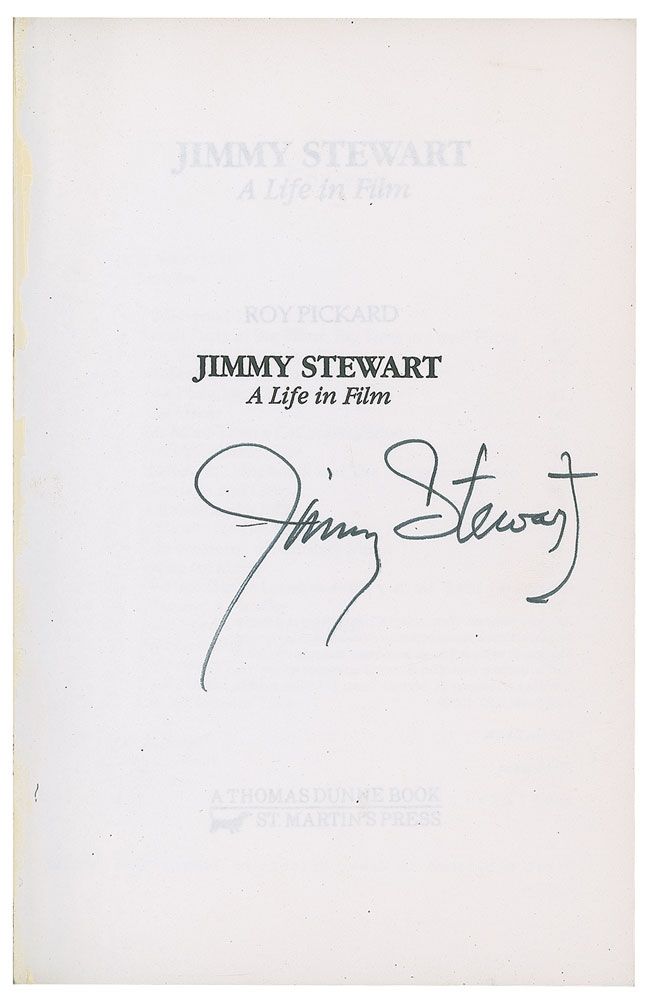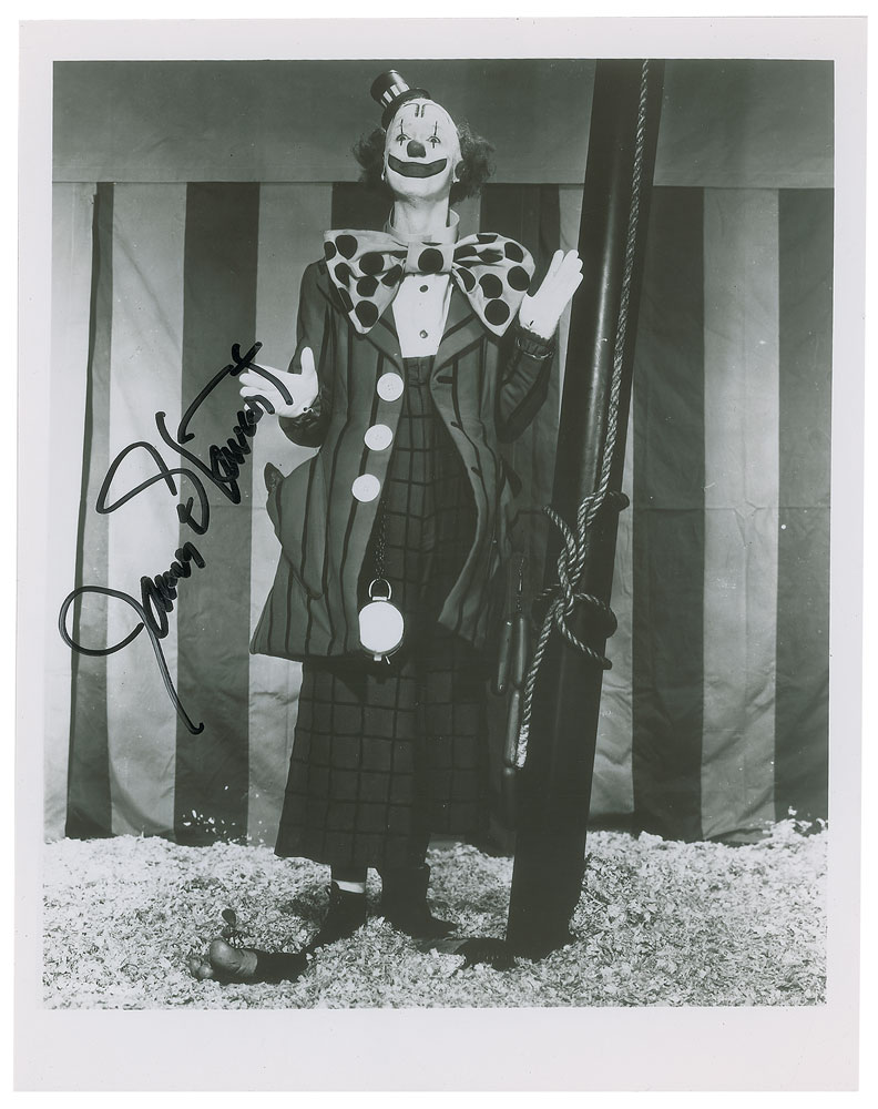 Two items: a glossy 8 x 10 photo of Stewart portraying a physician disguised as a clown because he is on the run from the police after euthanizing his wife in Cecil B. DeMille's 1952 circus spectacle The Greatest Show on Earth, signed in black felt tip, "James Stewart"; and a glossy pictorial advance reading copy of Roy Pickard's biography Jimmy Stewart: A Life in Film, signed on the half-title page in black felt tip, "Jimmy Stewart." In overall fine condition.