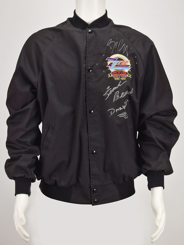 Very appealing black button-up jacket for ZZ Top's Recycler World Tour of 1990 and 1991, size extra-large, polyester-cotton shell and nylon liner, signed on the left chest near the embroidered tour patch in silver ink by Billy Gibbons, Frank Beard, and Dusty Hill. In fine condition. Accompanied by a full letter of authenticity from JSA. Consignor notes that this was signed in 1999.