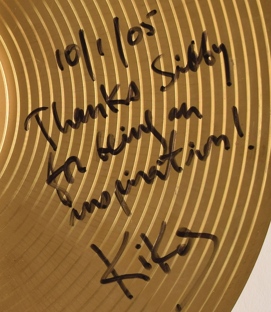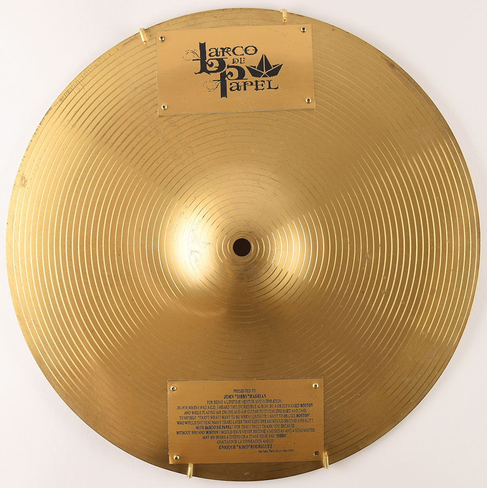 Sib Hashian's 14″ commemorative cymbal presented by Enrique 'Kiko' Rodriguez, featuring a "Barco de Papel" plaque at the top, and an engraved presentation plaque at the bottom, reading: "Presented to: John 'Sibby' Hashian, For being a lifetime mentor and inspiration. In 1976, when I was a kid, I heard this incredible album by a group named Boston and while playing air drums and air guitar to it I daydreamed and said to myself: 'That's what I want to be when I grow up, I want to be like Boston.' Who would say that many years later that kid's dream would become a reality with Barco de Papel? For that I truly thank you because without you and Boston I would have never become a musician and a songwriter. May we share a studio or a stage some day 'Sibby.' Gracias por la inspiracion amigo! Enrique 'Kiko' Rodriguez, San Juan, Puerto Rico, May 2005." The opposite side of the cymbal is also signed and inscribed in black felt tip, "10/1/05, Thanks Sibby for being an inspiration! Kiko." In fine condition. Provenance: From the Sib Hashian Collection, and accompanied by a letter of authenticity from the Hashian family. Proceeds to benefit The Sib Hashian Scholarship