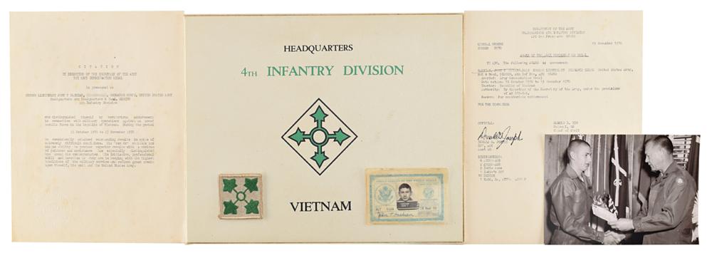 Group lot of four items from Sib Hashian's military service in the United States Army during the Vietnam War, including: Hashian's embroidered 4th Infantry Division patch; a laminated Armed Forces of the United States identification card, 3.5 x 2.25, with a small affixed photo of Hashian, who signs below, "John T. Hashian," that lists his service number and grade, "2LT USAR," with reverse featuring his thumb prints, date of birth, physical traits, date of issue, "23 Jan 70," and card number, "D160092"; a citation for "The Army Commendation Medal," as directed by the Secretary of the Army and presented to "Second Lieutenant John T. Hashian?Ordnance Corps, United States Army?4th Infantry Division, who distinguished himself by meritorious achievement in connection with military operations against an armed hostile force in the Republic of Vietnam. During the period 15 October 1970 to 15 November 1970," with accompanying transmittal letter from the Headquarters of the 4th Infantry Division, dated November 19, 1970; and a satin-finish photo of Hashian receiving the honor as a 21-year-old lieutenant. In overall very good to fine condition. Accompanied by the citation's original 4th Infantry Division presentation folder.